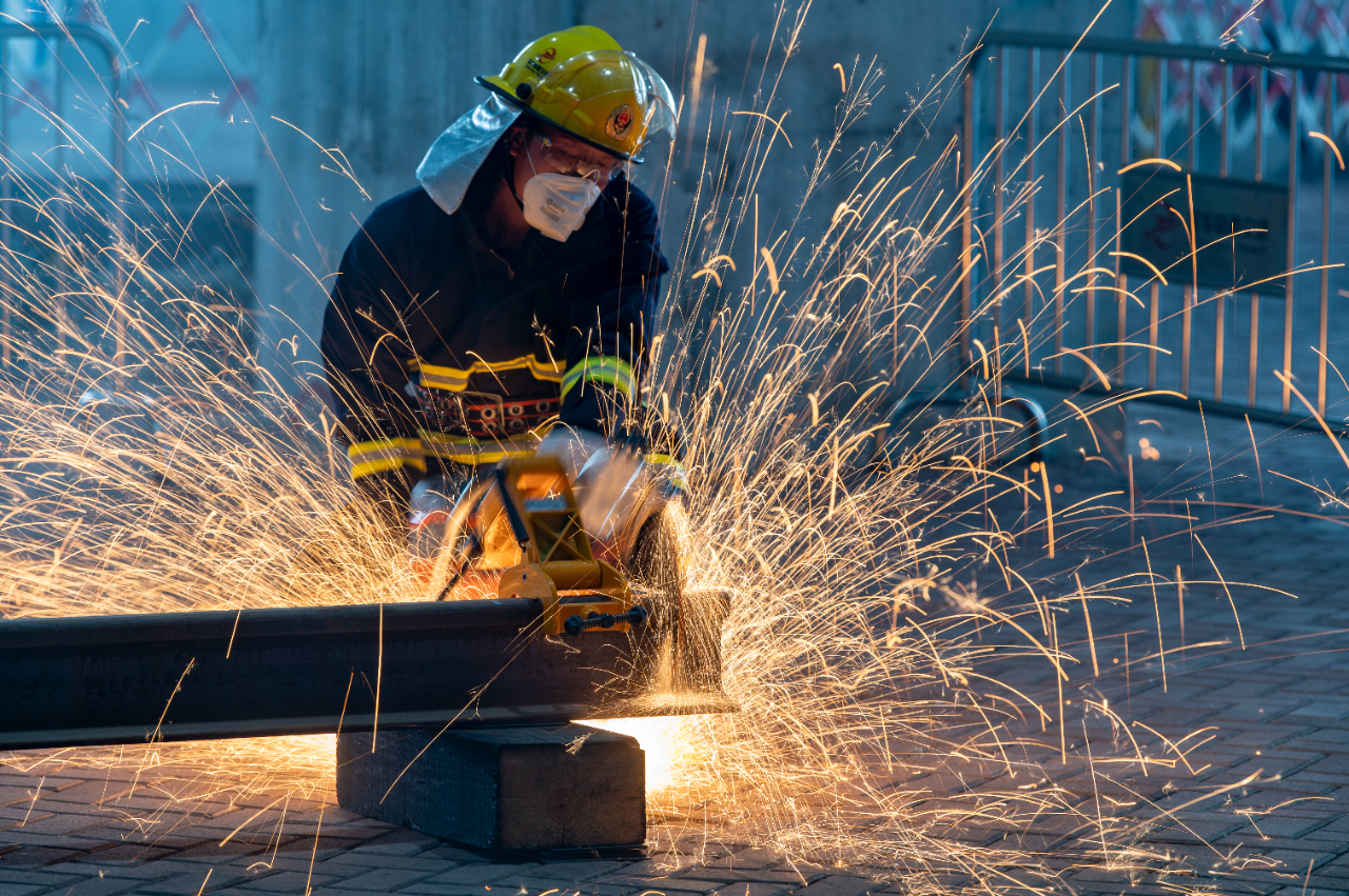 6月11日,在浙江省金華市金義東市域軌道交通工程塘雅車輛段,青年職工選手在參加軌道交通鋼軌切割項目技能比武。